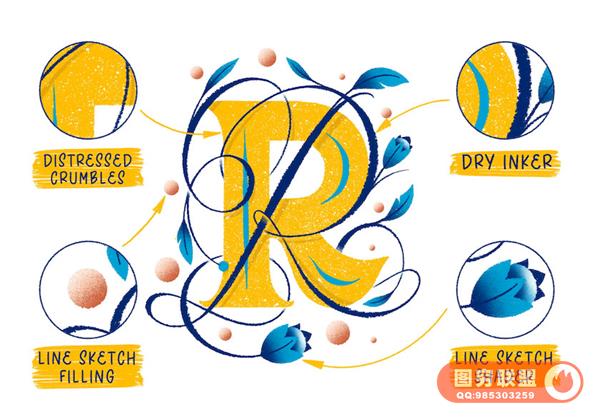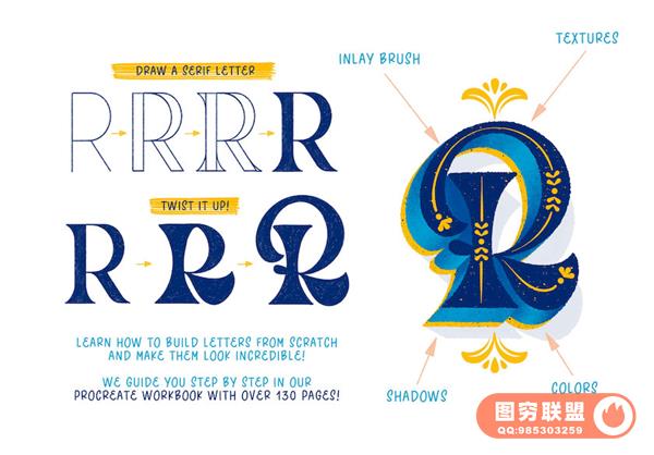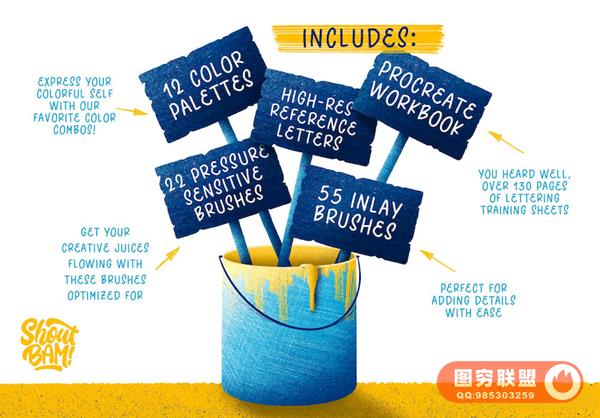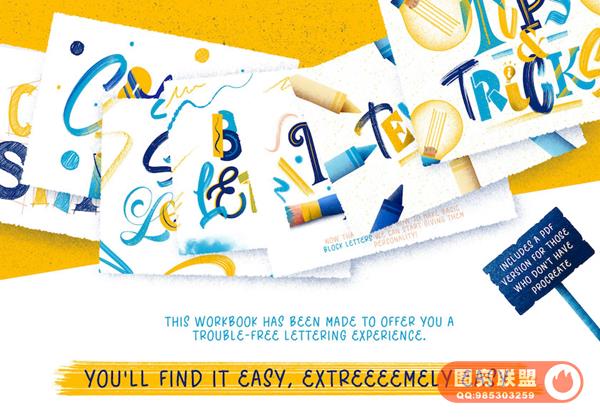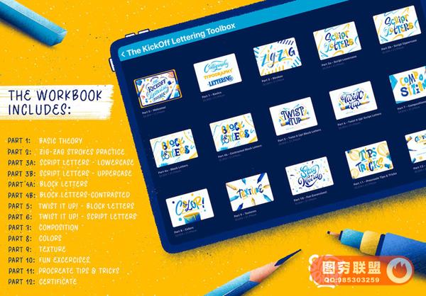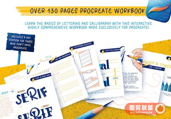 Procreate艺术手写字体笔刷和教程,可以帮助您快速学习艺术字设计。素材包含了画笔、装饰图形、教程、源文件、
