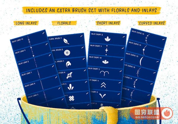 素材包含有55个装饰图形刷(装饰线条和装饰花型);