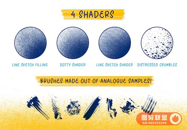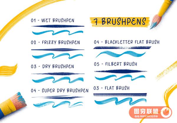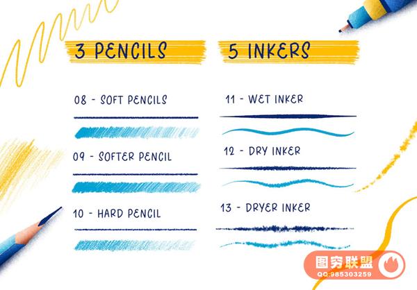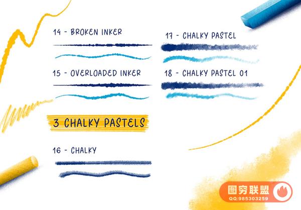 素材包含有22个画笔,其中3个铅笔笔刷,7个画笔笔刷,5个针管笔笔刷,3个粉笔笔刷和4个纹理填充笔刷);