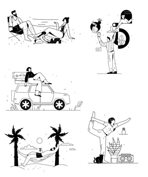 黑白人物日常办公互联网海报生活购物度假UI场景插画AI矢量素材