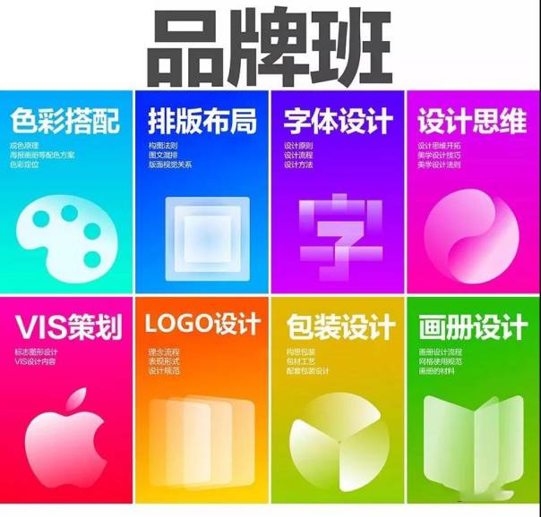 色彩搭配、画册设计、户外印刷、包装设计、VIS。课程内容偏向于基础入门,
