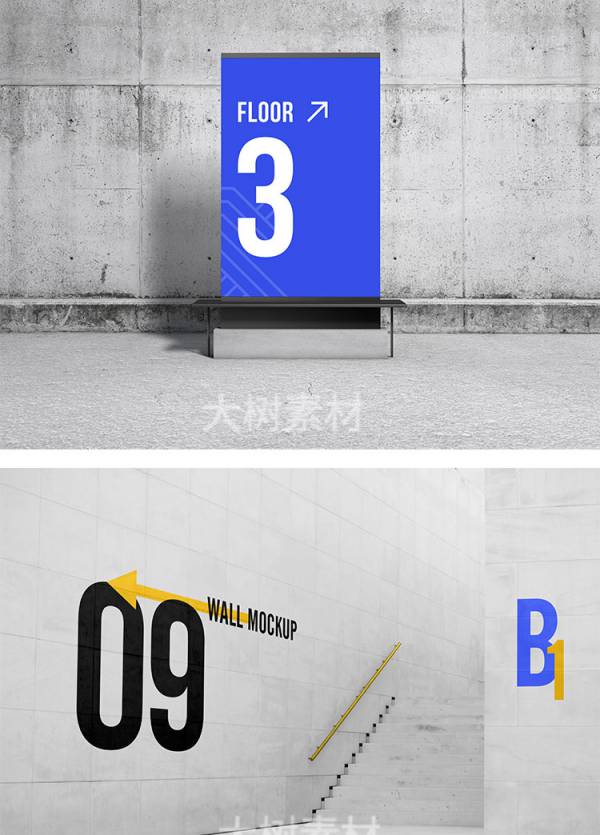 PS插件-导视指示牌商场墙面空间展示VI标志智能贴图样机设计PSD模板素材