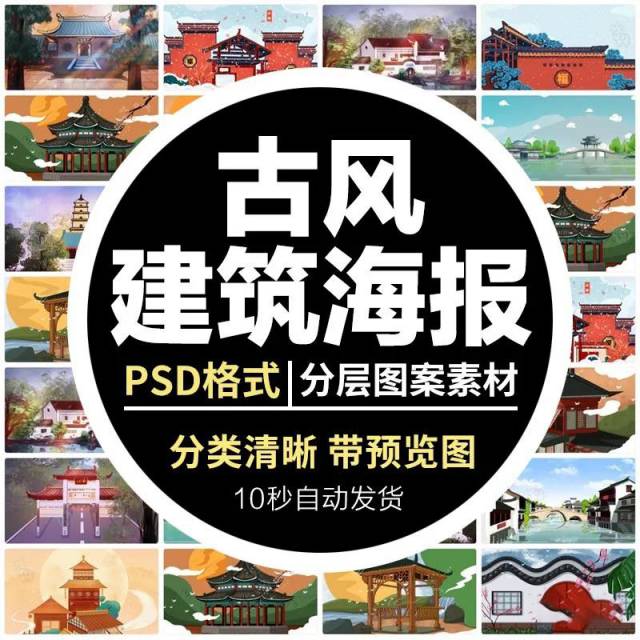PSD模板-中国风中式古典国潮手绘风景古建筑鱼龙海报插画PSD模板