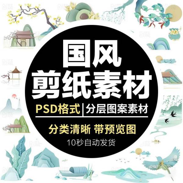 图穷设计网 » PNG素材-中国风复古烟青色清新山水剪纸元素景色PNG免扣素材