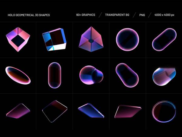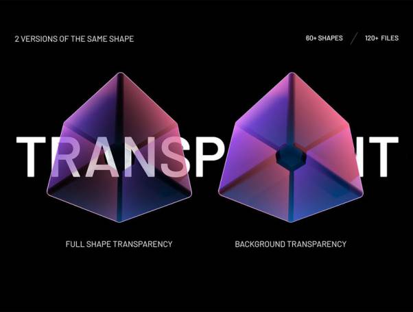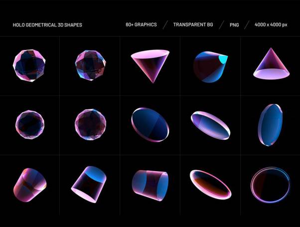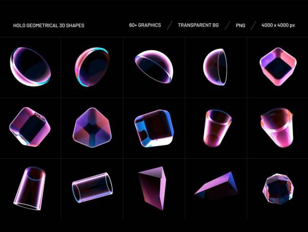 高质量的全息效果3D几何形状图形素材包,该素材包含 2 个版本:透明形状元素、不透明形状元素,素材总共有