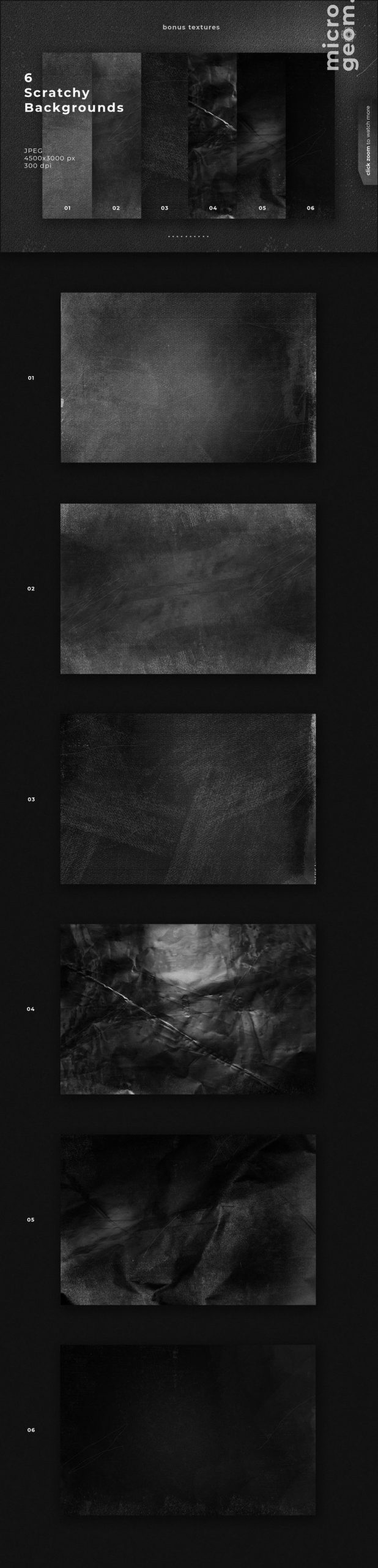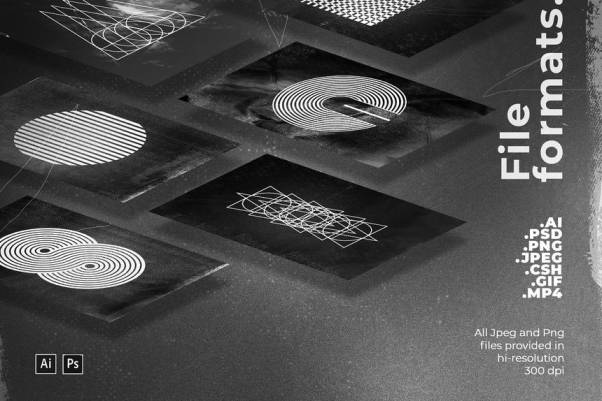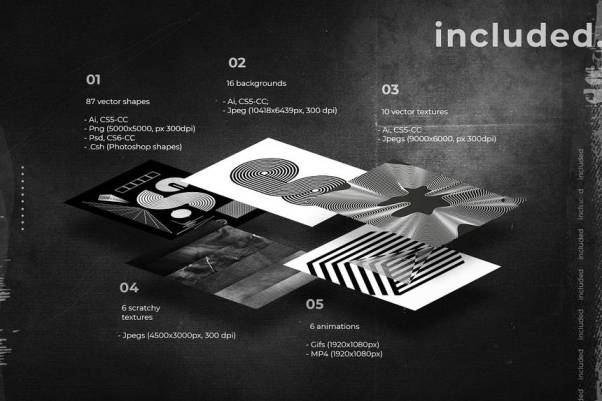6个粗糙的背景,JPEG(4500x3000px,300dpi);6个循环动画,GIF (1920x1080px),MP4 (1920x1080px)。