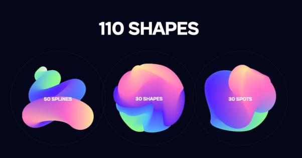 渐变彩色的抽象形状元素素材包,总共有110个不同的形状,包含有50个线条形状、30个图形形状、30个点状形状。