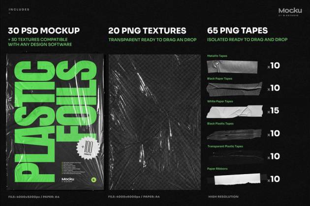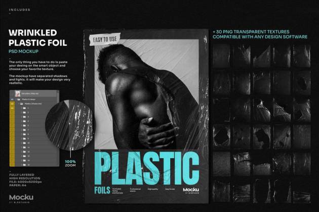 高质量的褶皱塑料薄膜样机叠加图片素材集合包,30个PSD皱纹塑料模型(A4尺寸)(4000x5200px) + 30个