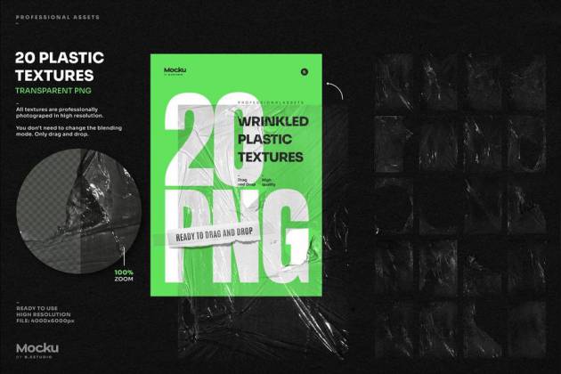 PNG文件;20个现成的PNG皱纹塑料纹理(A4规格)(4000x6000px);2个PSD解压动画模型(A4面)