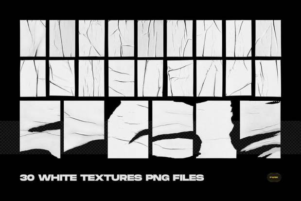高质量的海报粘贴褶皱纹理图片和展示样机素材,包含了30个不同粘贴褶皱纹理效果,每个纹理提供分层psd文件