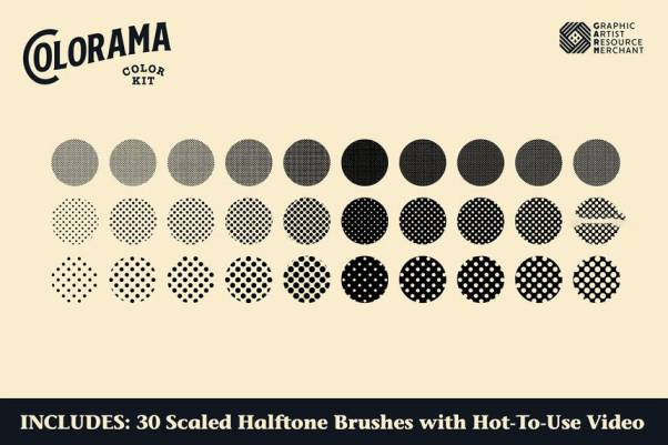 您可以直接将其导入您自己的库中。另外素材还提供30 种不同尺寸的定制半色调画笔。无论您是在处理品牌、