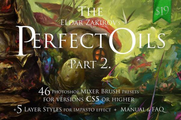 逼真的油画厚涂的Photoshop笔刷素材,包含了46 个 Mixer Brush TPL 预设 + 5 个 Impasto 效果图层样式,