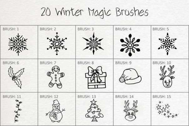 一套充满魅力的冬季主题图案PS笔刷素材,总共有20个不同的冬季图案笔刷,包括设计细节各异的雪花、姜饼人、