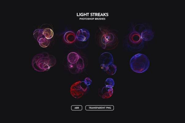 未来科技风的霓虹灯光效果ps笔刷素材,该素材中包含一个ABR文件,以及十个透明的PNG文件,也可以用作