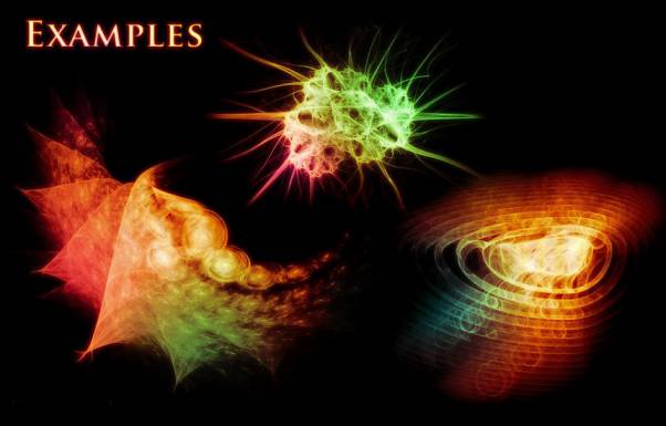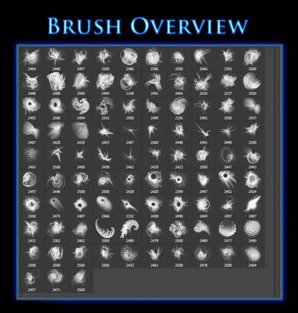 超现实主义抽象艺术图案的Photoshop笔刷素材,总共有93个笔刷,笔刷图形在分形渲染工具apophysis上生产,