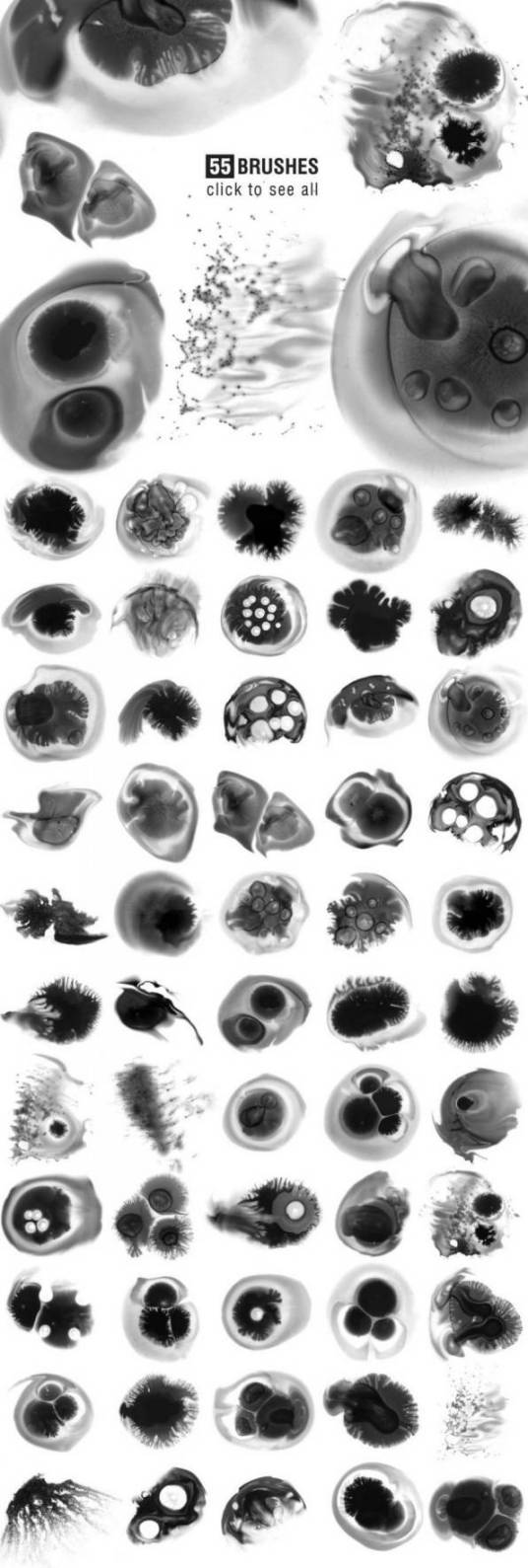 逼真液体纹理的微观世界效果图案ps笔刷素材,素材内总共有55个具有不同晕染纹理变化效果的液体笔刷,
