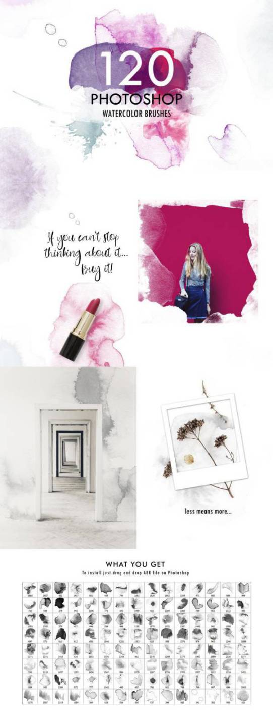 纹理独特的水彩渍晕染扩散效果Photoshop笔刷素材,素材内总共有120个具有不同纹理变化效果的水彩笔刷,