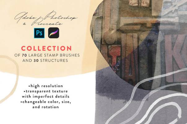 高分辨率抽象图形的ps水彩印章笔刷。笔刷包含了70污渍笔刷,30个抽象图形笔刷。这是一组高分辨率的笔刷,
