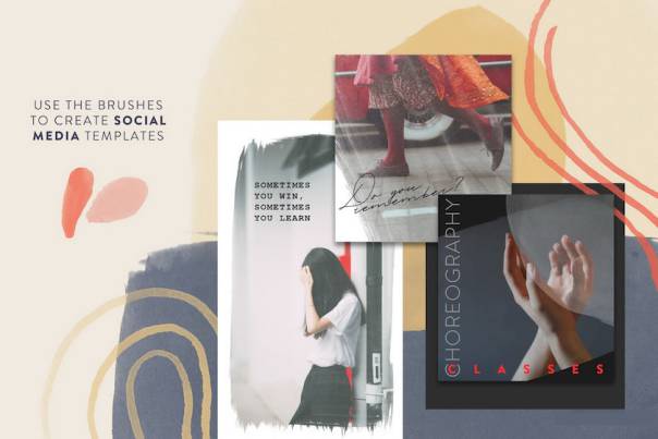 上面涂满水彩,水粉,丙烯酸颜料和手绘线性抽象图形。每个笔刷都有真实的水彩质感。您可以轻松更改画笔
