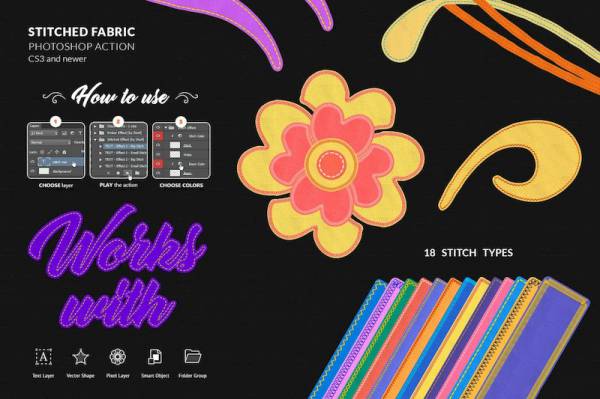 精美逼真的针线缝线效果ps笔刷插件,文件内包含了3种大小的18个高分辨率画笔,您可以选择任何颜色