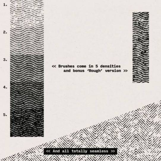 独特无缝拼接的Photoshop半色调笔刷,总共有5个类别共计122个笔刷,包含有20个压敏型图案、12个网格