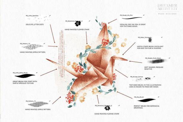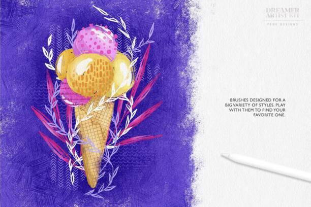 梦想艺术家手绘艺术绘画主题procreate笔刷素材,包括36个笔刷、20个图案笔刷和12个图章笔刷,其中包含