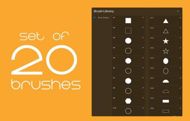 基础规则几何图形procreate笔刷素材,总共有20个基础图形笔刷,分为实心和线条轮廓这2种样式,包括