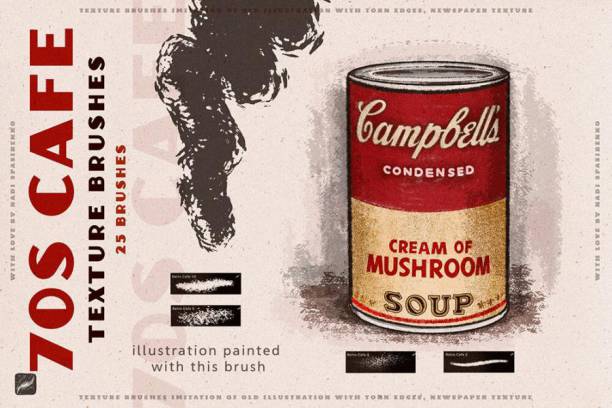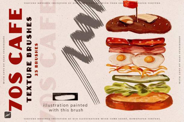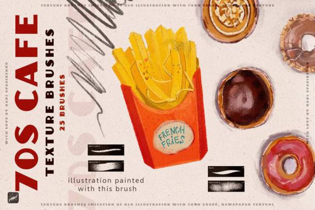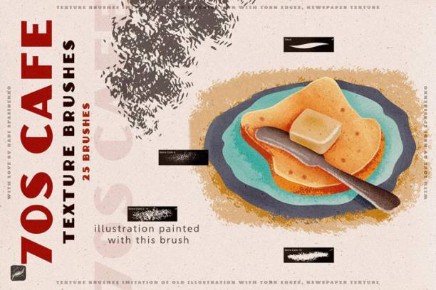 70年代复古风格插画的Procreate纹理笔刷,这套刷子总共有25个复古纹理的笔刷,以及7种PNG纸张纹理,