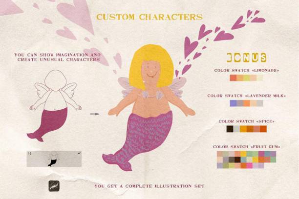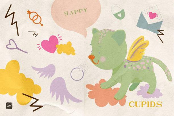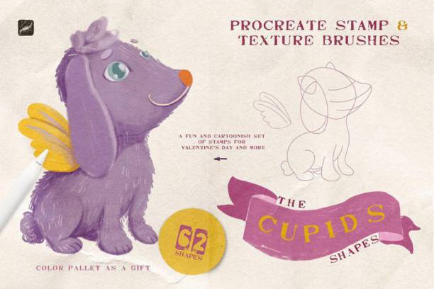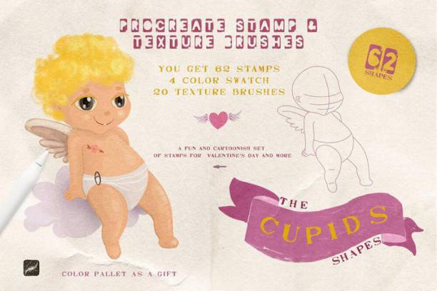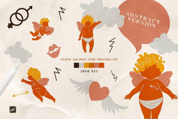 一套卡通多彩手绘风格的爱神丘比特主题Procreate笔刷素材,包括62个爱神图案笔刷、4种色板和20个纹理笔刷,