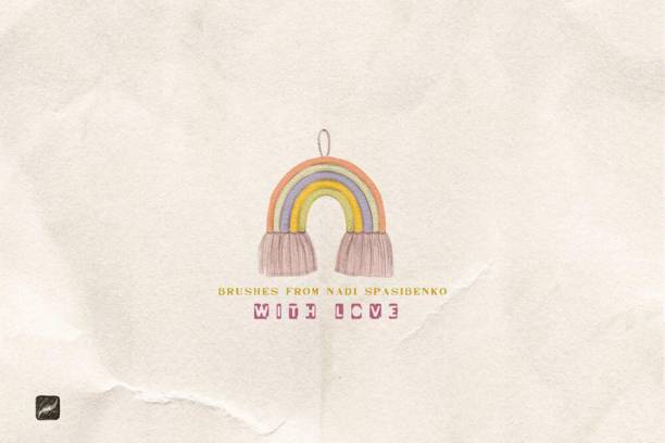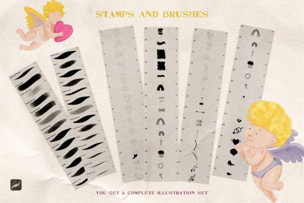 笔刷包含丘比特、翅膀、彩虹、信封、云朵等,风格趣味,可以用于平面设计底纹。您可以随意变换笔刷的颜色,