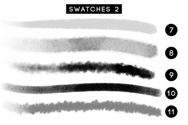 国画水墨毛笔晕染宣纸纹理Procreate笔刷素材,总共有11个具有不同粗细、纹理变化效果的高品质笔刷。笔刷