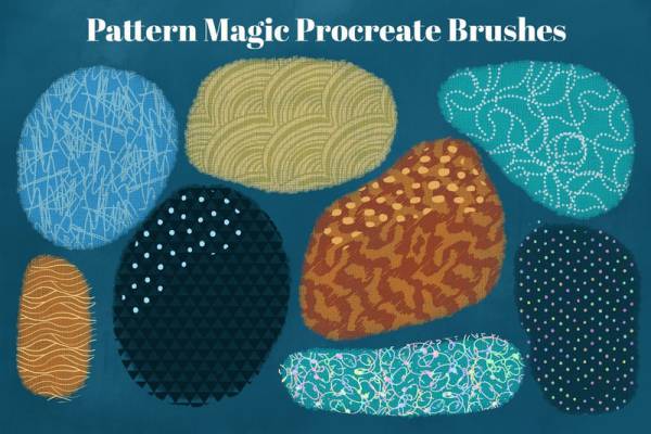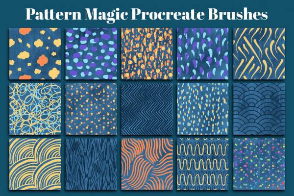 复古奇妙风格的手绘图案Procreate笔刷素材,包括50个不同手绘线条纹理的无缝图案笔刷和7个额外的基础笔刷,