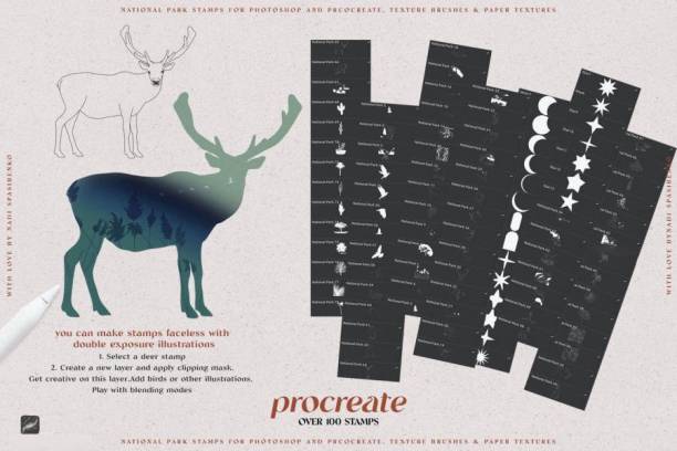 一套Procreate图案纹理笔刷素材,包含有山脉、风景、花卉、动物、几何形状、