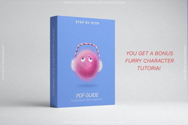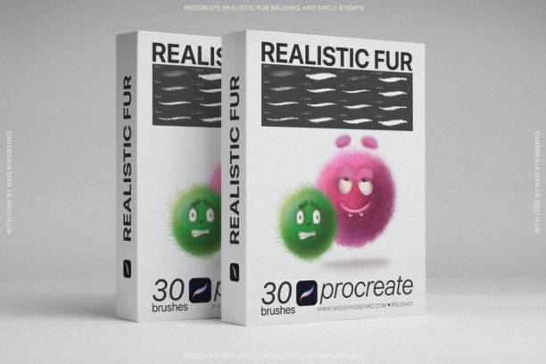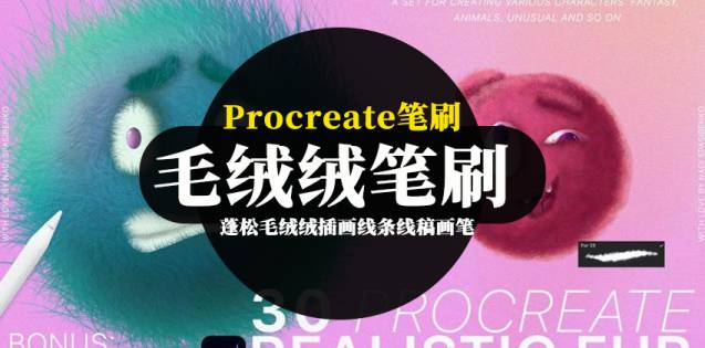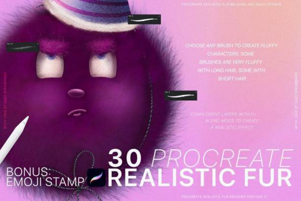 本套Procreate笔刷素材包含30 种不同类型的蓬松毛绒绒(长毛和短毛)画笔和 32个表情符号插画线稿画笔。