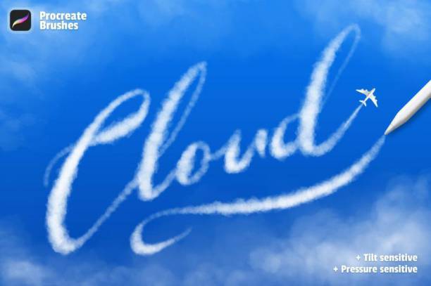 一套procreate云朵笔刷,可帮助你创建逼真的飞机飞过后的云朵文字或图形。笔刷总共有7个画笔,其中5个为云朵字画笔、