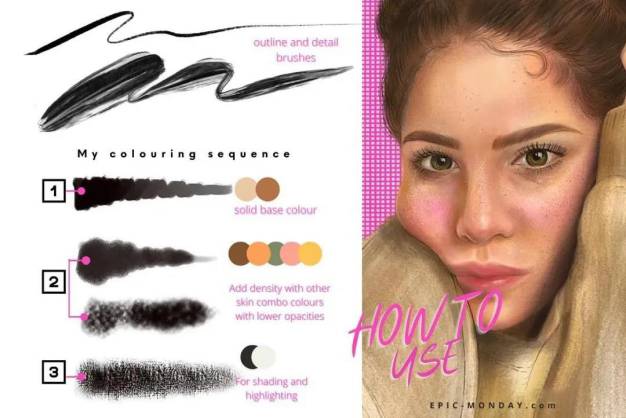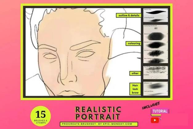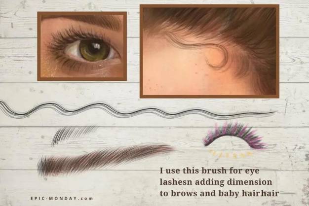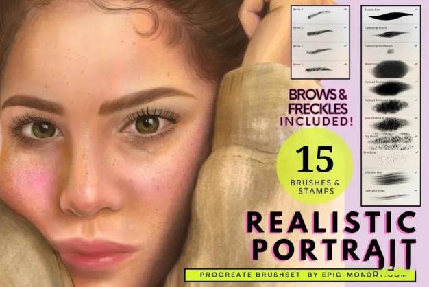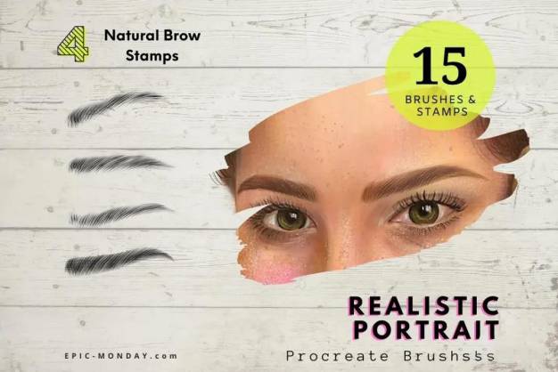 该笔刷套装包括11种基本肖像画笔和4个自然眉头。