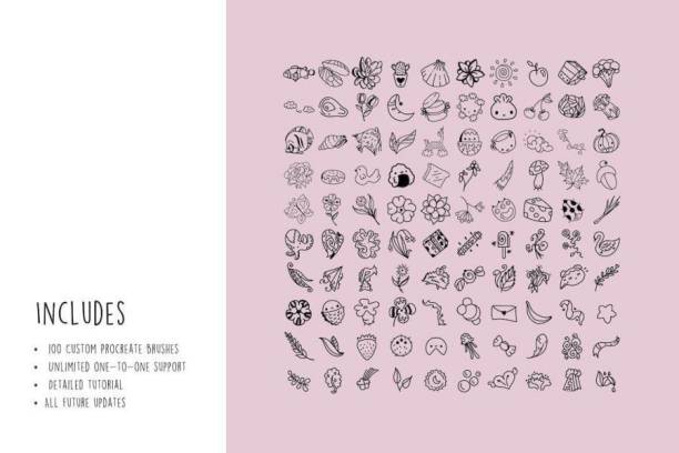 一套可爱线条插画的procreate图案笔刷素材,总共有100多个可爱的插画画笔,