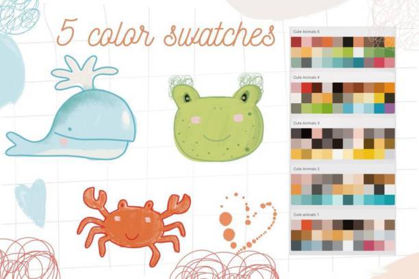 宠物、海洋动物、外来动物和热带动物等。另外素材还包含 5 个可爱的调色板(色板)和 150 种可爱的动物流行色。