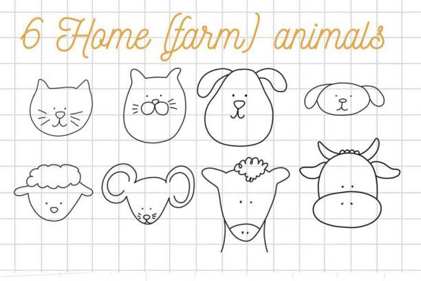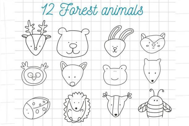 一组可爱的卡通动物插画线条procreate笔刷素材,总共有50多个动物的绘画线稿图,包括森林动物和昆虫、农场动物和家庭