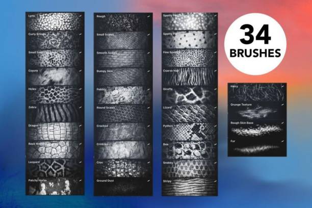 长颈鹿、斑马、鳞片、爬行动物皮肤、怪物纹理。纹理的大小随画笔大小而变化,以实现完美控制。还可以
