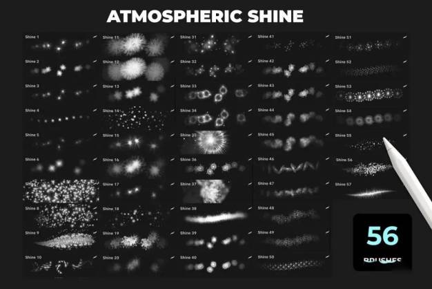 56支高清画笔。它们中最小的是600 x 600像素。分辨率约为1000 x 1000像素。