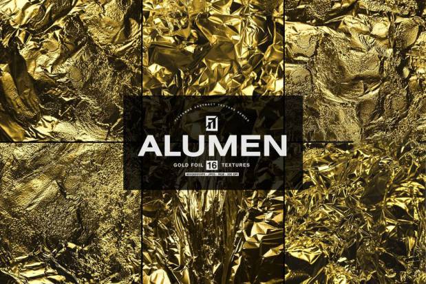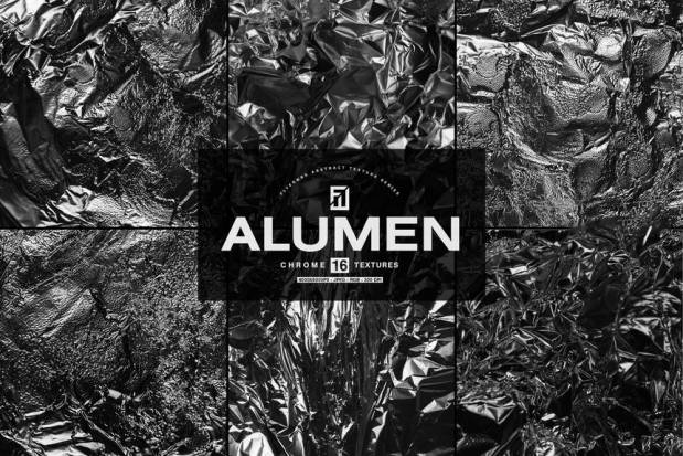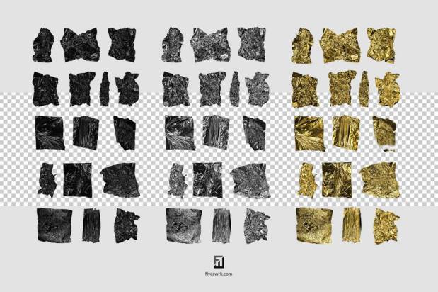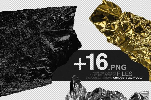 高质量的金属锡箔纸纹理背景图片素材,素材包含了16张透明背景的独立金属箔纹理元素(png),16张混合纹理