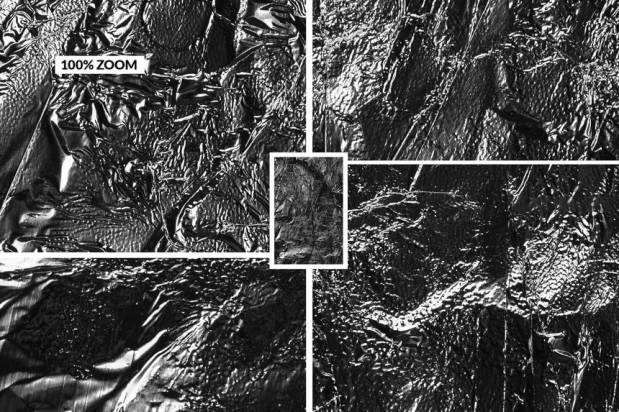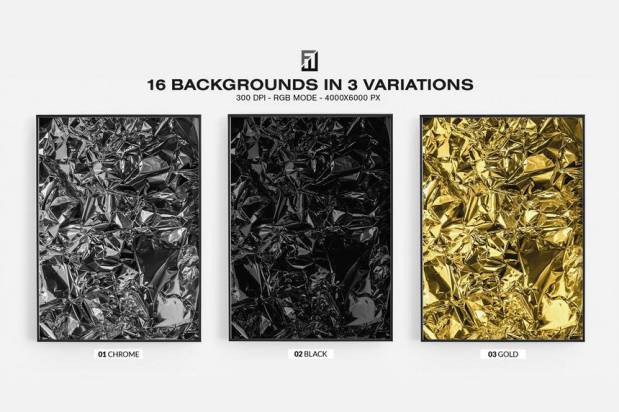 的金属箔纹理背景图(jpg,4000 x 6000px),每种纹理都有镀铬、黑色和金色三种颜色变化。每个纹理中使用的
