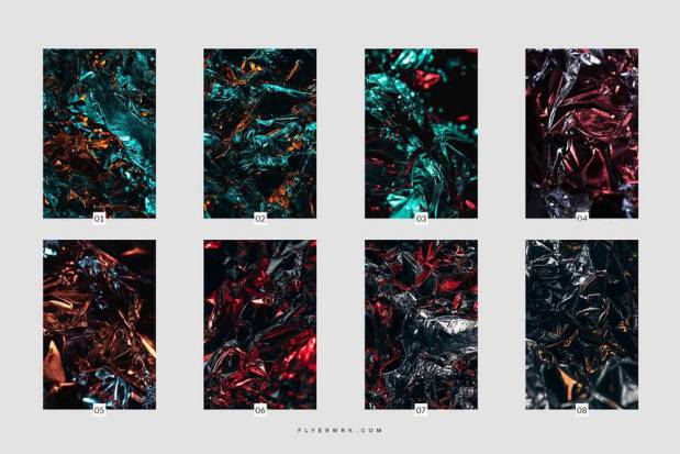 抽象的皱巴巴金属箔纹理背景图片素材,总共包含了16张图片,图片为jpg格式,尺寸为4000 x 6000px, 300dpi。
