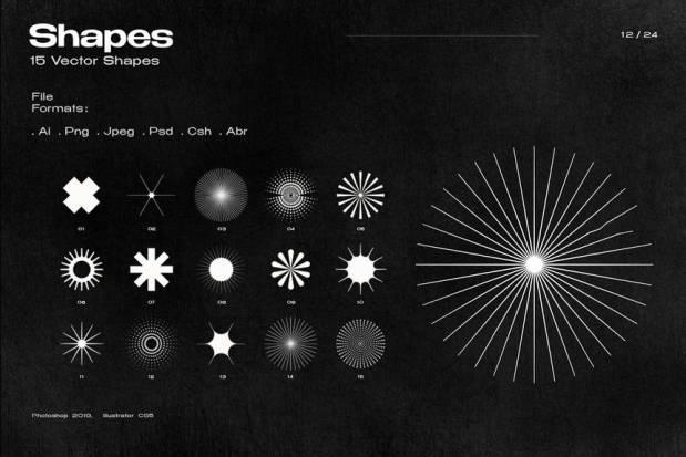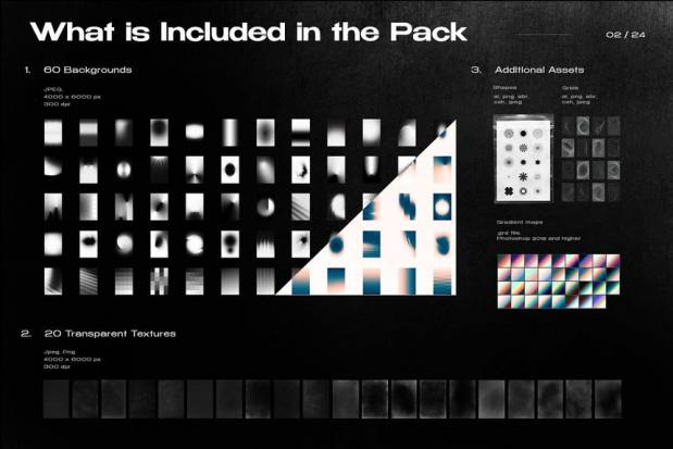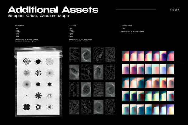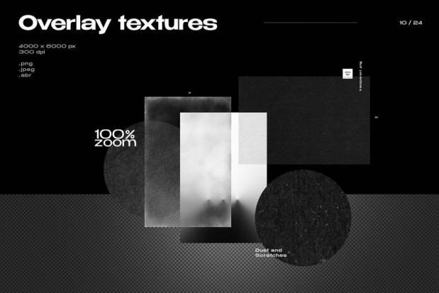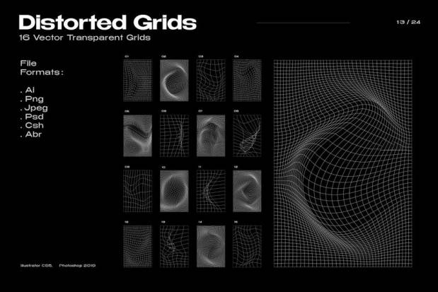 20 个透明纹理- jpeg、png、(4000 x 6000 像素、300 dpi)、abr; 15 个形状和 16 个网格 - ai、psd、png、jpeg、