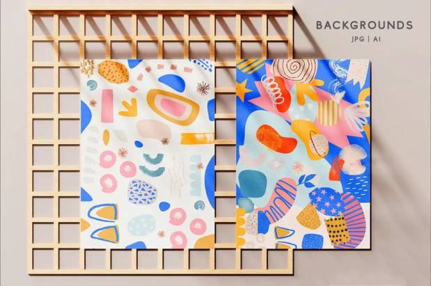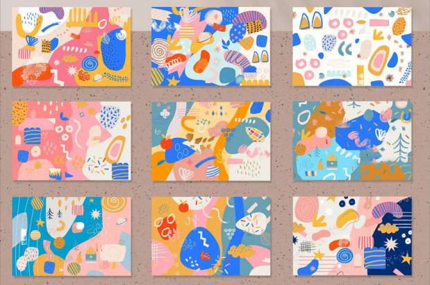 手绘抽象几何拼贴插画图案的矢量背景图素材,总共有12种不同图案的背景图,图案为各种颜色的抽象图形,也有各种