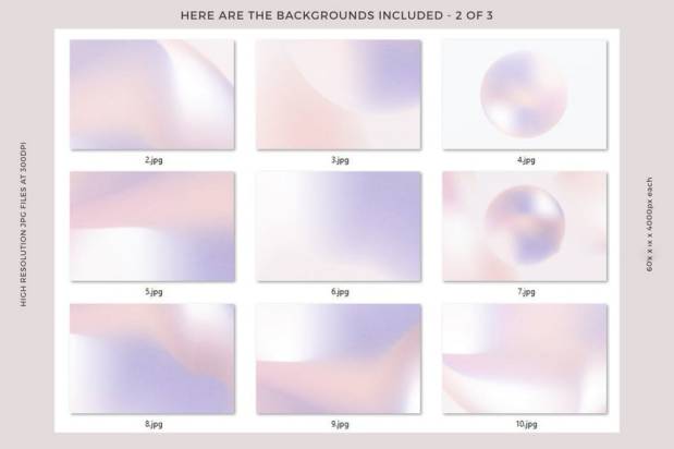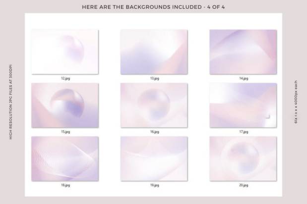 粒状纹理抽象图形渐变色背景图片素材,包含了20 张高分辨率 JPG 渐变背景,图片尺寸为6000 x 4000px,300 dpi。