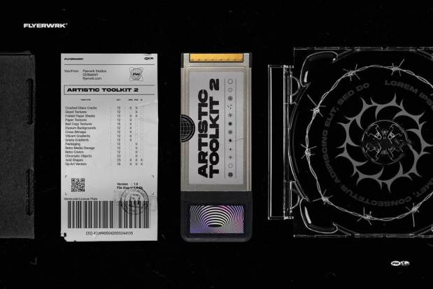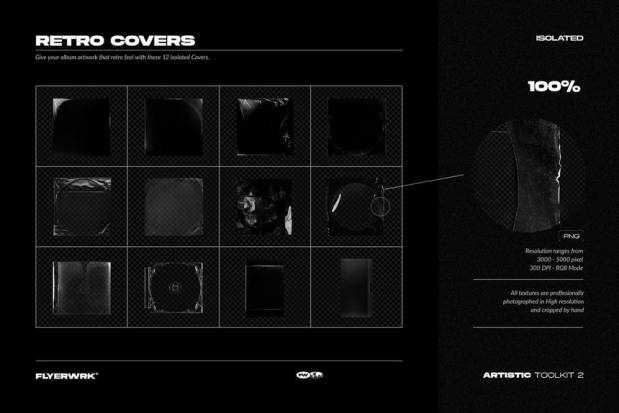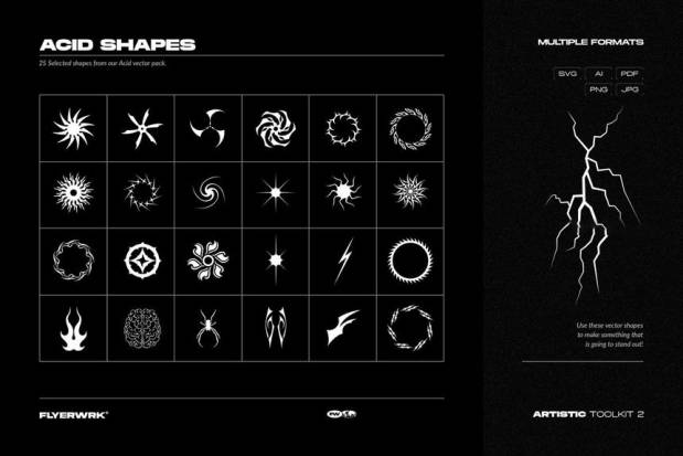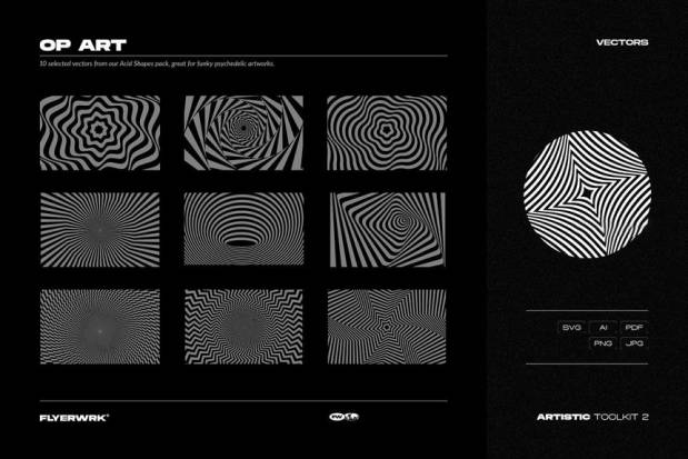 纹理、12 个包装图形、12 个复古媒体存储、12 个复古封面、22个 彩色物体、10 个OP-艺术、25 个酸性形状、