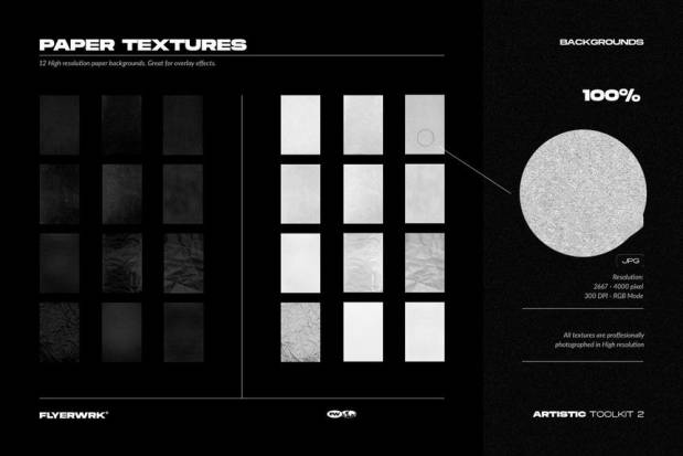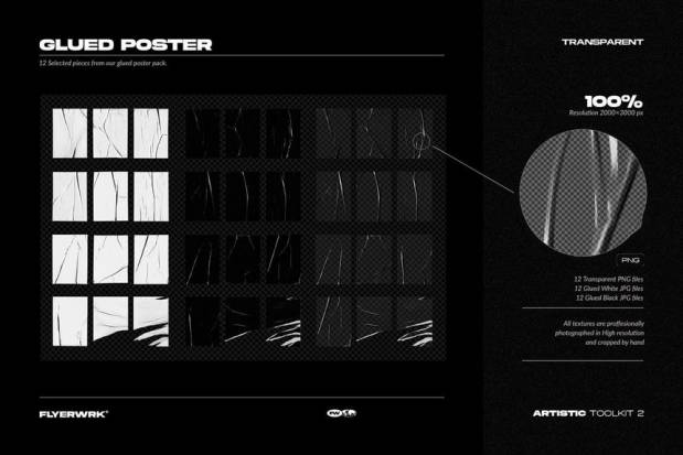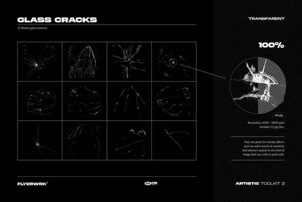 素材包含有:12 个玻璃裂纹、12 个胶合纹理、12 张折叠纸、15 个错误的复制纹理、12 个交叉位图、12 张纸张