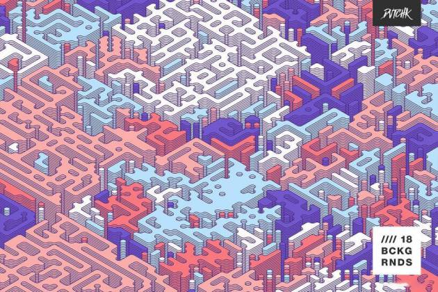 等距视角的彩色立体圆柱迷宫矢量背景图素材,总共有18 个彩色实验等距背景,素材提供AI、JPG格式文件,